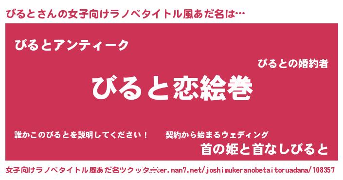 | 男性向けラノベタイトル風あだ名 | 『おまえをオタクにしてやるから、俺をびるとにしてくれ! 』 |