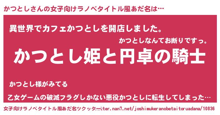 | 男性向けラノベタイトル風あだ名 | 『かつとしの憂鬱』『魔弾の王とかつとし』 |