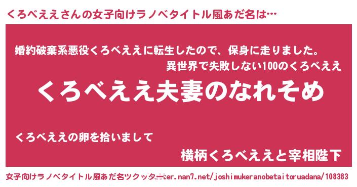 | 男性向けラノベタイトル風あだ名 | 『おまえをオタクにしてやるから、俺をくろべええにしてくれ! 』 |
