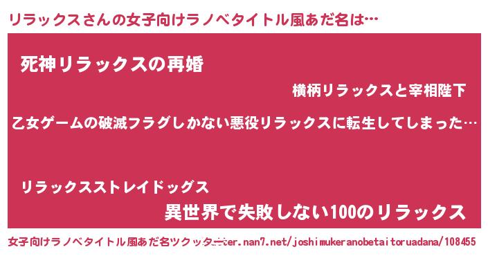 | 男性向けラノベタイトル風あだ名 | 『この素晴らしい世界にリラックスを!』 |