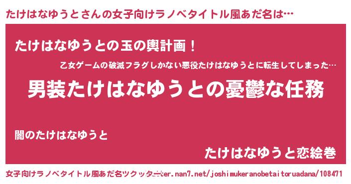 | 男性向けラノベタイトル風あだ名 | 『うちのたけはなゆうとが世界を掌握している!』 |