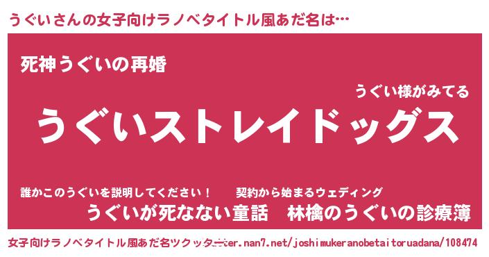 | 男性向けラノベタイトル風あだ名 | 『Re:うぐいから始める異世界生活』 |