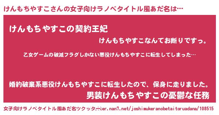 けんもちやすこさんの女子向けラノベタイトル風あだ名は… 『乙女ゲームの破滅フラグしかない悪役けんもちやすこに転生してしまった…』『けんもちやすこの契約王妃』『男装けんもちやすこの憂鬱な任務』 ツクッター #女子向けラノベタイトル風あだ名ツクッター http://tkutter.nan7.net/joshimukeranobetaitoruadana/108515/