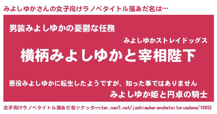 みよしゆかさんの女子向けラノベタイトル風あだ名は… 『横柄みよしゆかと宰相陛下』『男装みよしゆかの憂鬱な任務』『みよしゆか姫と円卓の騎士』 ツクッター #女子向けラノベタイトル風あだ名ツクッター http://tkutter.nan7.net/joshimukeranobetaitoruadana/10852/
