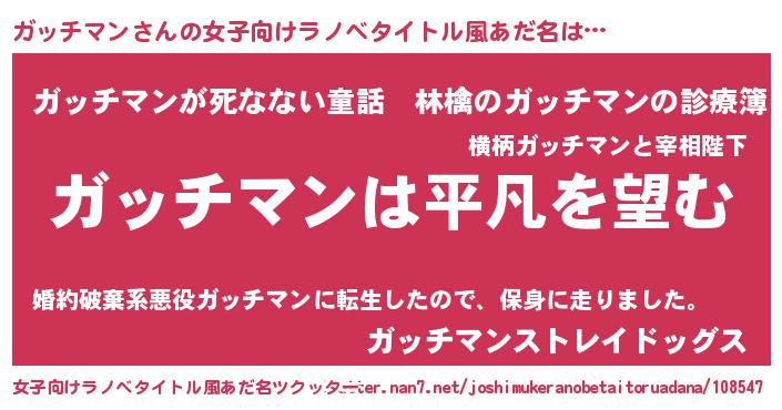 | 男性向けラノベタイトル風あだ名 | 『ダンジョンにガッチマンを求めるのは間違っているだろうか』 |