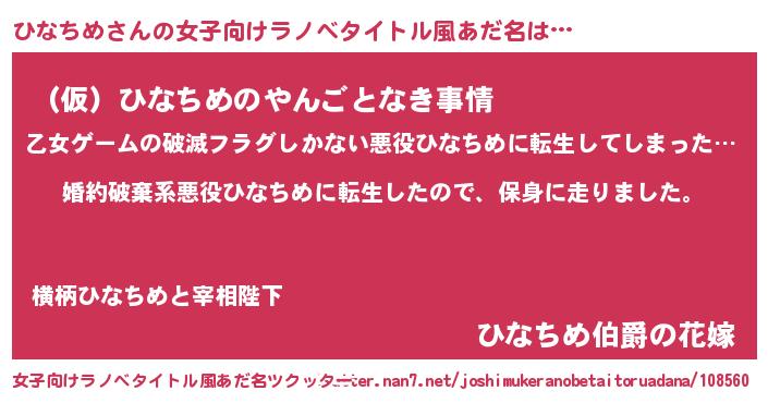 | 男性向けラノベタイトル風あだ名 | 『ヒナチメスレイヤー』『ひなちめの憂鬱』 |