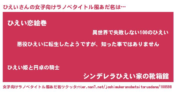 | 男性向けラノベタイトル風あだ名 | 『この素晴らしい世界にひえいを!』 |