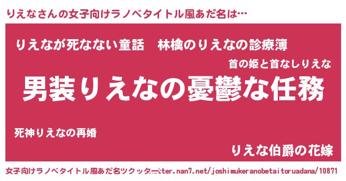 | 男性向けラノベタイトル風あだ名 | 『うちのりえなが世界を掌握している!』 |