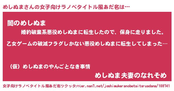 | 男性向けラノベタイトル風あだ名 | 『この素晴らしい世界にめしぬまを!』 |