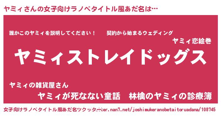 | 男性向けラノベタイトル風あだ名 | 『Re:ヤミィから始める異世界生活』 |