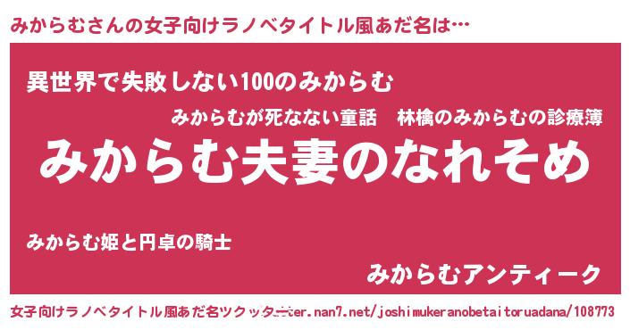 | 男性向けラノベタイトル風あだ名 | 『おまえをオタクにしてやるから、俺をみからむにしてくれ! 』 |