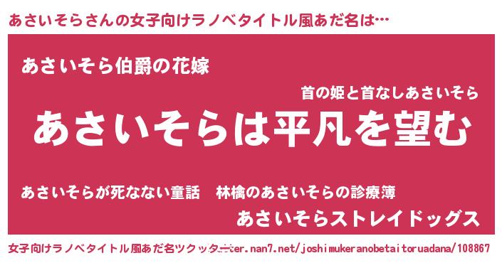 | 胡散臭い通販商品みたいなあだ名 | 『信頼と実績のサプリメント…その名も「あさいそら」』 |