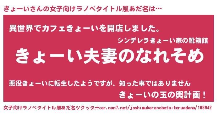 | 男性向けラノベタイトル風あだ名 | 『おまえをオタクにしてやるから、俺をきょーいにしてくれ! 』 |
