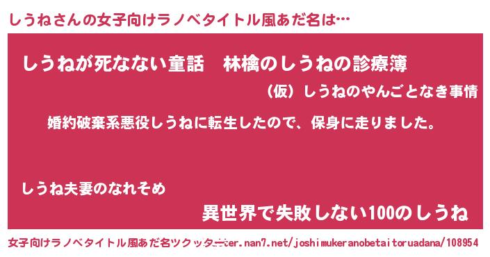 | 胡散臭い通販商品みたいなあだ名 | 『世界中を虜にした100年もののヴィンテージワイン…その名も「しうね」』 |
