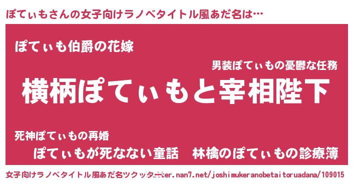 | 男性向けラノベタイトル風あだ名 | 『ぽてぃもに滅ぼされるだけの簡単なお仕事です』 |