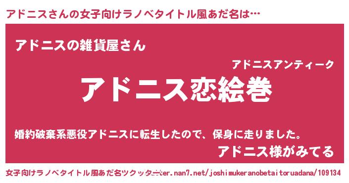 | 男性向けラノベタイトル風あだ名 | 『おまえをオタクにしてやるから、俺をアドニスにしてくれ! 』 |