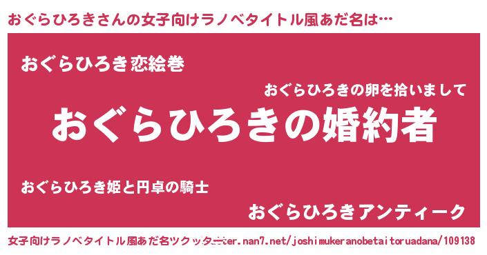 おぐらひろきさんの女子向けラノベタイトル風あだ名は… 『おぐらひろきの婚約者』『おぐらひろき恋絵巻』『おぐらひろきアンティーク』 ツクッター #女子向けラノベタイトル風あだ名ツクッター http://tkutter.nan7.net/joshimukeranobetaitoruadana/109138/