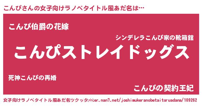 | 男性向けラノベタイトル風あだ名 | 『Re:こんぴから始める異世界生活』 |
