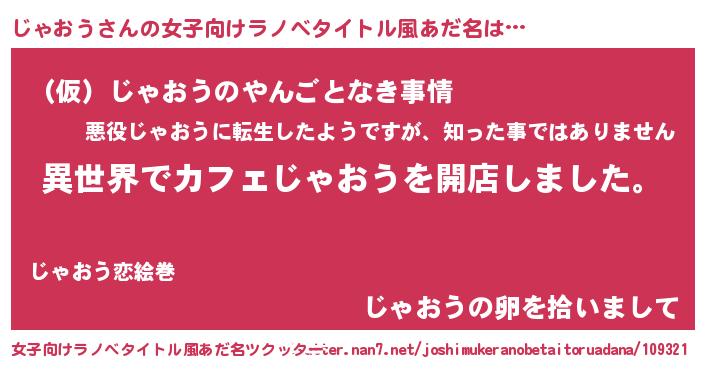 | 男性向けラノベタイトル風あだ名 | 『誰もが恐れるあのじゃおうが、ぼくの専属メイドになるようです。』 |