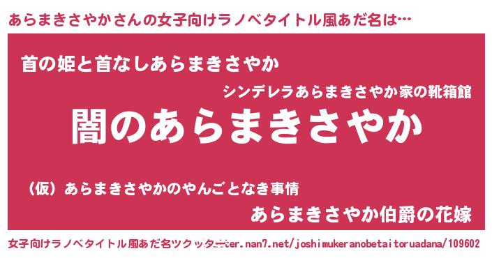 | 男性向けラノベタイトル風あだ名 | 『Re:あらまきさやかから始める異世界生活』 |