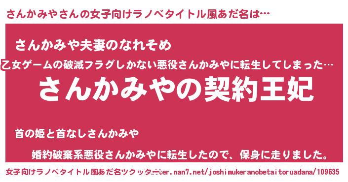 | 胡散臭い通販商品みたいなあだ名 | 『来世でも幸せになれる健康食品…その名も「さんかみや」』 |