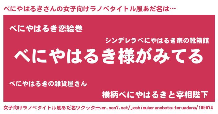| 男性向けラノベタイトル風あだ名 | 『べにやはるきの嫁は女の子じゃないと思った?』 |