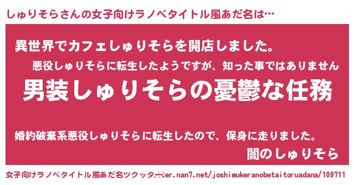| 男性向けラノベタイトル風あだ名 | 『うちのしゅりそらが世界を掌握している!』 |