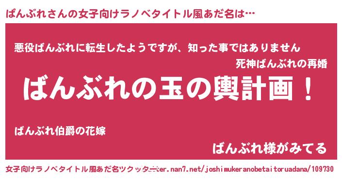 | 男性向けラノベタイトル風あだ名 | 『ばんぶれ~年齢イコール彼女いない歴の魔法使い~』 |