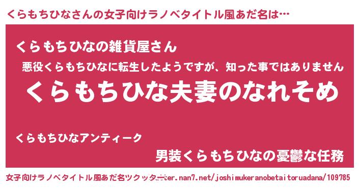 | 男性向けラノベタイトル風あだ名 | 『おまえをオタクにしてやるから、俺をくらもちひなにしてくれ! 』 |