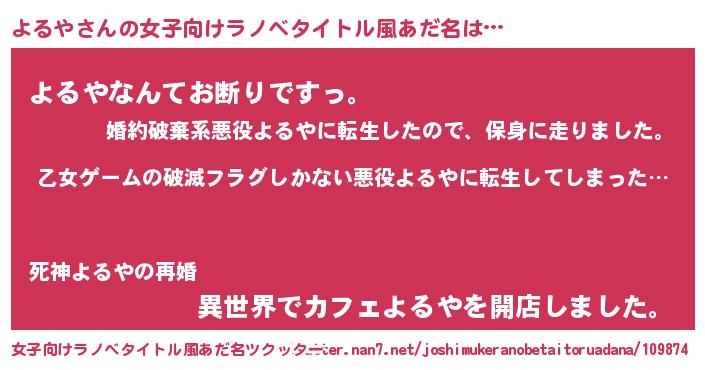 | 男性向けラノベタイトル風あだ名 | 『この素晴らしい世界によるやを!』 |