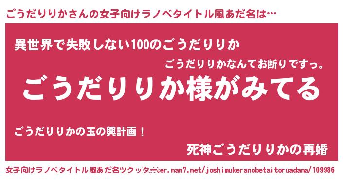 | 男性向けラノベタイトル風あだ名 | 『ごうだりりかの嫁は女の子じゃないと思った?』 |