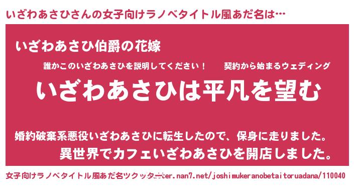 | 男性向けラノベタイトル風あだ名 | 『ダンジョンにいざわあさひを求めるのは間違っているだろうか』 |