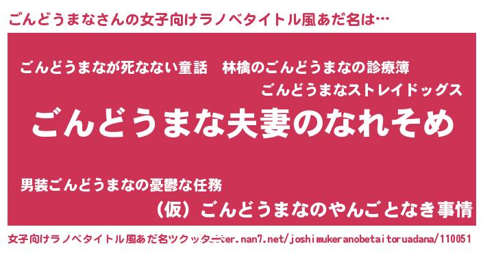 | 男性向けラノベタイトル風あだ名 | 『おまえをオタクにしてやるから、俺をごんどうまなにしてくれ! 』 |