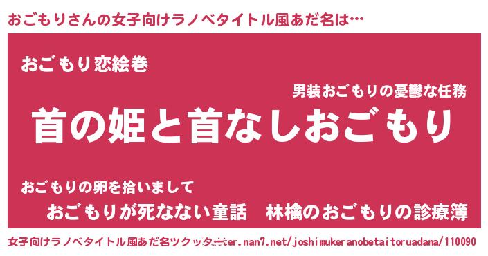 おごもりさんの女子向けラノベタイトル風あだ名は… 『首の姫と首なしおごもり』『おごもり恋絵巻』『おごもりが死なない童話 林檎のおごもりの診療簿』 ツクッター #女子向けラノベタイトル風あだ名ツクッター http://tkutter.nan7.net/joshimukeranobetaitoruadana/110090/