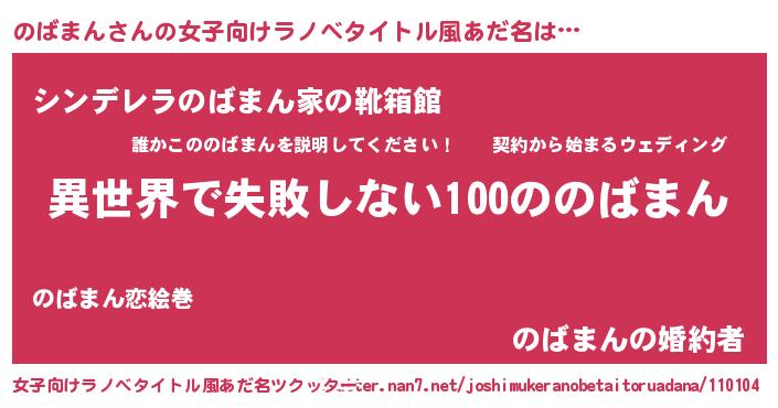 | 男性向けラノベタイトル風あだ名 | 『のばまんという概念が存在しない退屈な世界 』 |