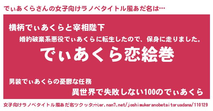 | 男性向けラノベタイトル風あだ名 | 『おまえをオタクにしてやるから、俺をでぃあくらにしてくれ! 』 |