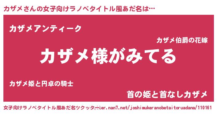 | 男性向けラノベタイトル風あだ名 | 『カザメの嫁は女の子じゃないと思った?』 |