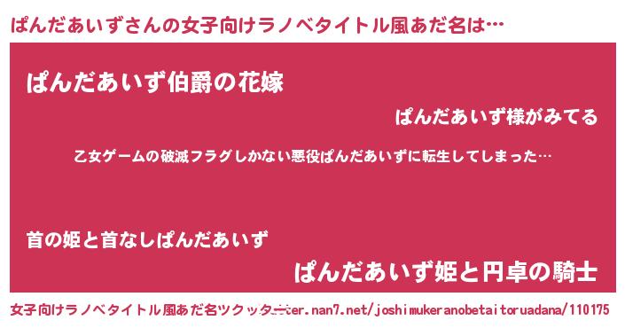 | 男性向けラノベタイトル風あだ名 | 『魔弾の王とぱんだあいず』 |