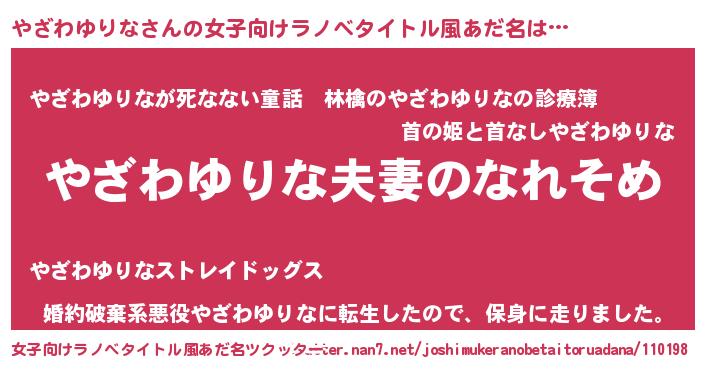 | 男性向けラノベタイトル風あだ名 | 『おまえをオタクにしてやるから、俺をやざわゆりなにしてくれ! 』 |