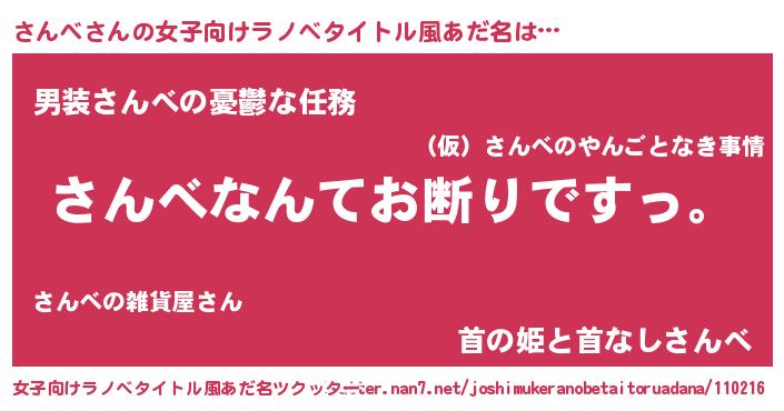 | 男性向けラノベタイトル風あだ名 | 『魔法科高校のさんべ』『さんべの憂鬱』 |