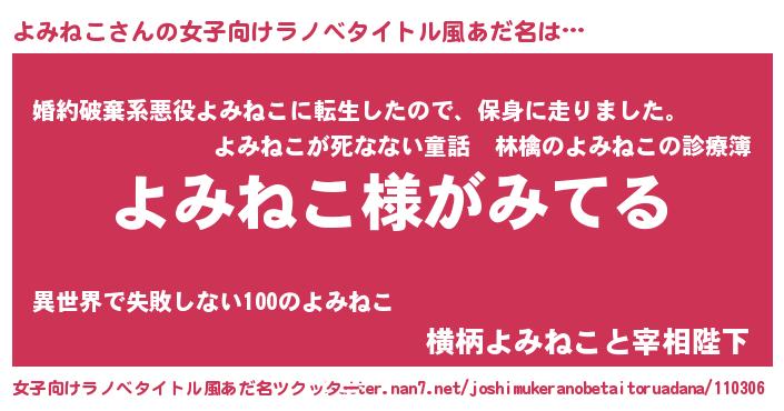 | 男性向けラノベタイトル風あだ名 | 『よみねこの嫁は女の子じゃないと思った?』 |