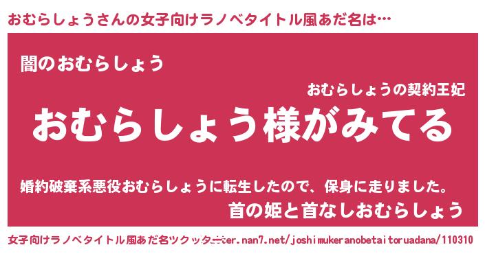 | 男性向けラノベタイトル風あだ名 | 『おむらしょうの嫁は女の子じゃないと思った?』 |