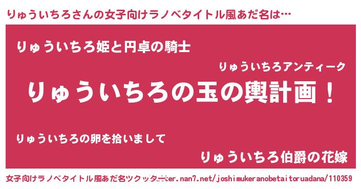 りゅういちろさんの女子向けラノベタイトル風あだ名は… 『りゅういちろの玉の輿計画!』『りゅういちろ姫と円卓の騎士』『りゅういちろ伯爵の花嫁』 ツクッター #女子向けラノベタイトル風あだ名ツクッター http://tkutter.nan7.net/joshimukeranobetaitoruadana/110359/