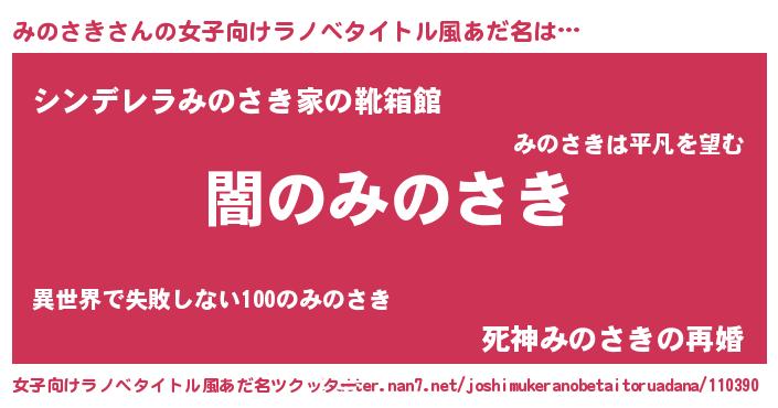 | 男性向けラノベタイトル風あだ名 | 『Re:みのさきから始める異世界生活』 |