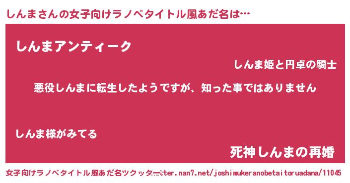 | 男性向けラノベタイトル風あだ名 | 『この素晴らしい世界にしんまを!』 |