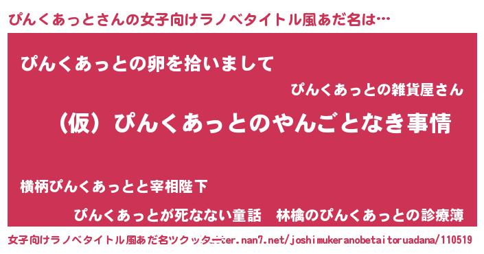 ぴんくあっとさんの女子向けラノベタイトル風あだ名は… 『(仮)ぴんくあっとのやんごとなき事情』『ぴんくあっとの卵を拾いまして』『ぴんくあっとが死なない童話 林檎のぴんくあっとの診療簿』 ツクッター #女子向けラノベタイトル風あだ名ツクッター http://tkutter.nan7.net/joshimukeranobetaitoruadana/110519/