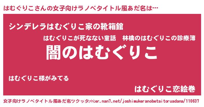 | 男性向けラノベタイトル風あだ名 | 『Re:はむぐりこから始める異世界生活』 |
