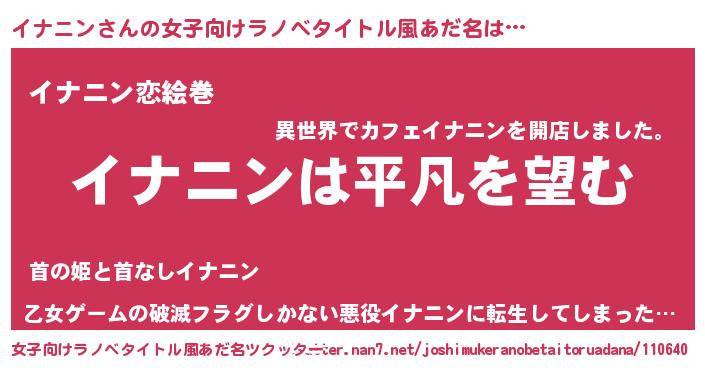 | 男性向けラノベタイトル風あだ名 | 『ダンジョンにイナニンを求めるのは間違っているだろうか』 |