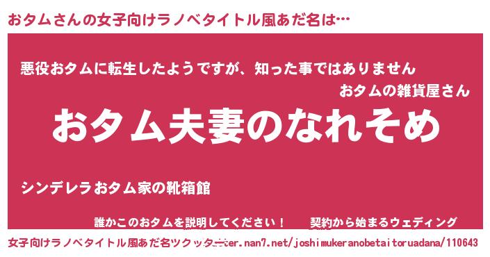 | 男性向けラノベタイトル風あだ名 | 『おまえをオタクにしてやるから、俺をおタムにしてくれ! 』 |