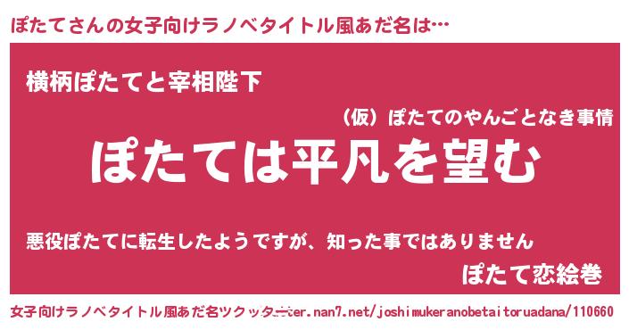 | 男性向けラノベタイトル風あだ名 | 『ダンジョンにぽたてを求めるのは間違っているだろうか』 |